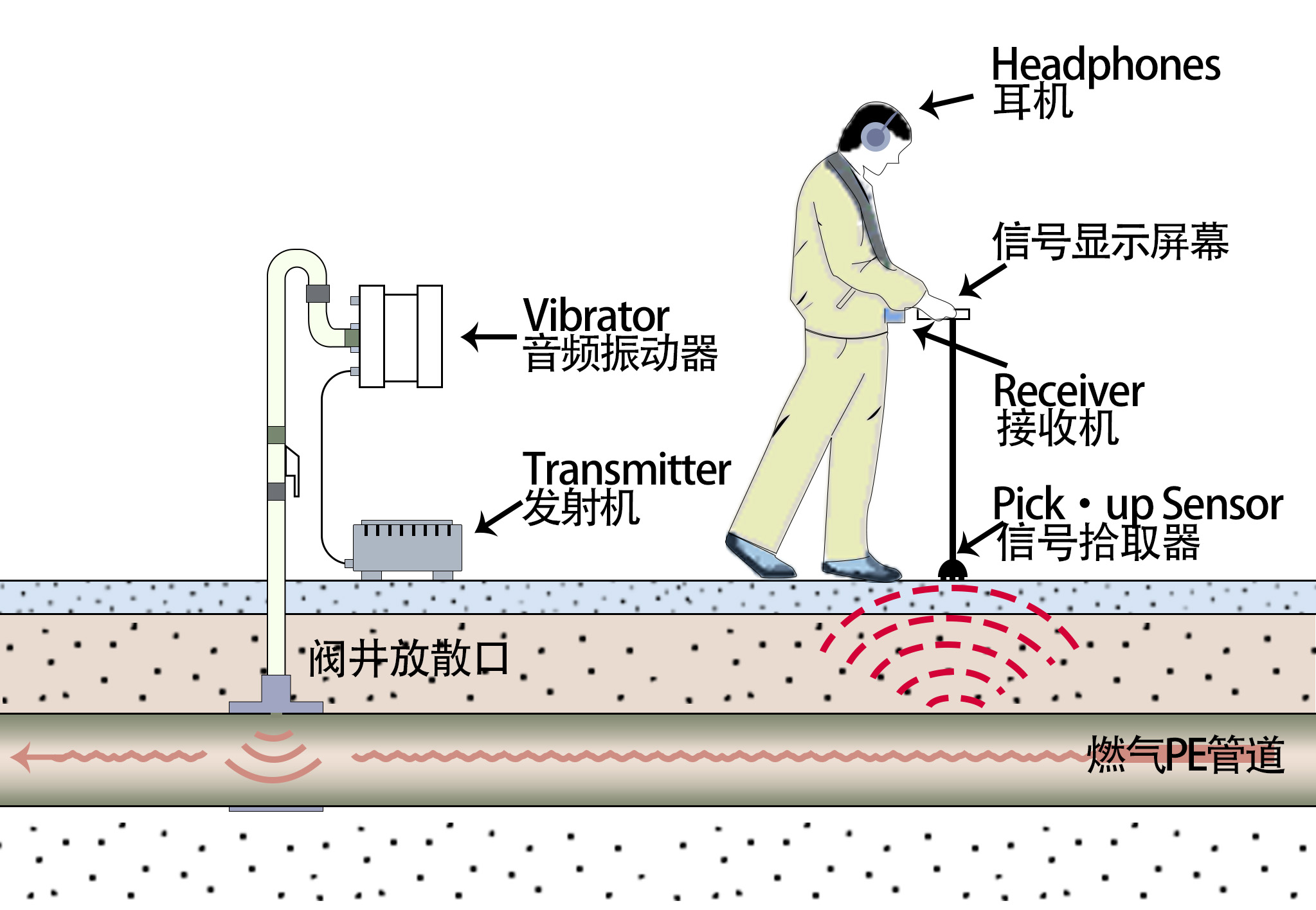 主動聲源探測法是通過音頻器發(fā)射裝置向燃?xì)夤艿纼?nèi)發(fā)射特定頻率的聲波信號,信號沿管道定向傳播至遠(yuǎn)端,該聲波信號在管道壓力氣體中定向傳播的同時(shí),通過管壁土壤傳播至地面;同時(shí)接收機(jī)在地面上捕捉該聲波信號,通過地表持續(xù)接收信號的強(qiáng)弱值而進(jìn)行精準(zhǔn)定位法。