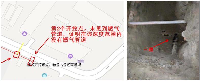 在了解到燃?xì)夤驹?007年前后均無穿越(頂管或者拖拉管)管道施工之后,我們決定在這兩個(gè)無信號的位置開挖,證明原圖管道不存在或者是由于聲源信號自然衰減造成的信號消失。