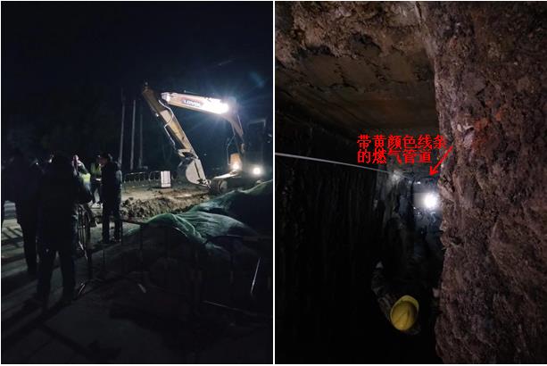 我們探測人員從早上一直在現(xiàn)場探測,直到晚上九點(diǎn),人工開挖出來見到黃顏色線條的管道,才放心撤離。