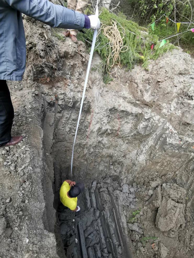 (2)首先要使用主動聲源探測在地表搜索聲源信號,如果管道埋深太深,無法接收到信號或者信號范圍寬、太弱,可以先用挖機(jī)往下開挖一段溝槽,縮短信號到達(dá)地表的距離,確定管道位置后,先用先探棒在管道位置進(jìn)行釬探,釬探點(diǎn)距距離不得大于管道1/2直徑,確定地面1.2米以下無管道后,挖機(jī)繼續(xù)開挖,直到釬探到管道,采用人工開挖,最終要見到帶黃顏色的PE管。