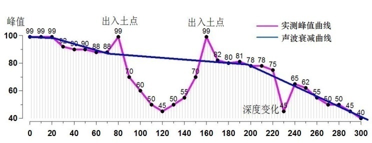 如下圖,假設(shè)閥井內(nèi)信號源位于橫坐標(biāo)0m處,沿橫坐標(biāo)探測距離300m,附近信號峰值距離信號源一定距離后,信號值逐步自然衰減,在管道出入土點(diǎn)位置信號異常強(qiáng)烈,隨后在穿越管段段內(nèi)迅速減弱。
